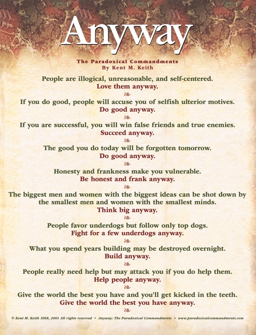 I invite you to sit with the poem and see if any of the commandments resonate with you. Then, consider what you might need to ‘do anyway’ to bring more harmony and balance to your life. I have done this a few times, and the insights and resolution have often been remarkable.